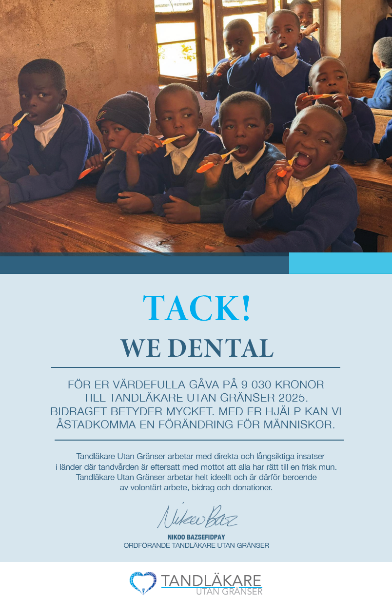 Under 2025 har vi på WE Dental utfört 903 undersökning på er patienter. För varje undersökning så skänker vi 10kr till Tandläkare utan gränser. I år har vi skänkt 9 030kr och detta är något vi gjort tillsammans.